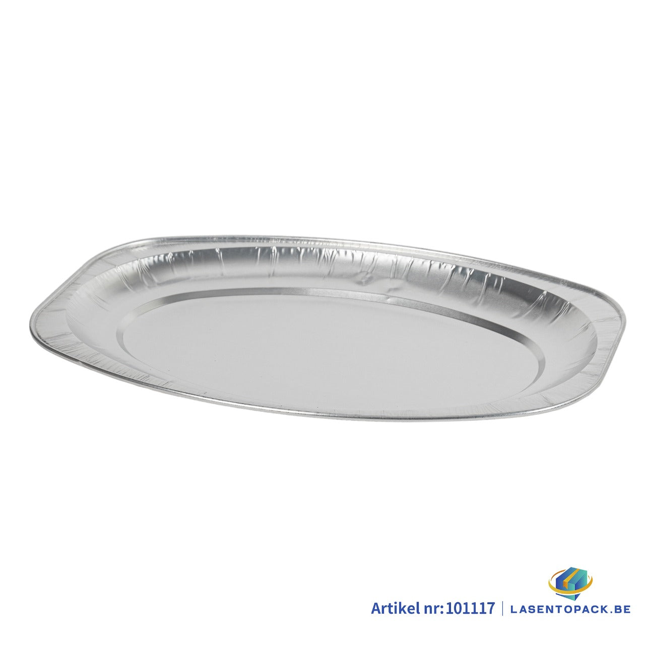 Aluminium Schaal met afmetingen 426 x 286 x 29 mm en afgeronde hoeken. Geschikt voor serveren, bakken en verwarmen in de oven. Verpakking: 100 stuks per doos.