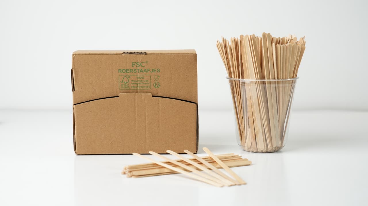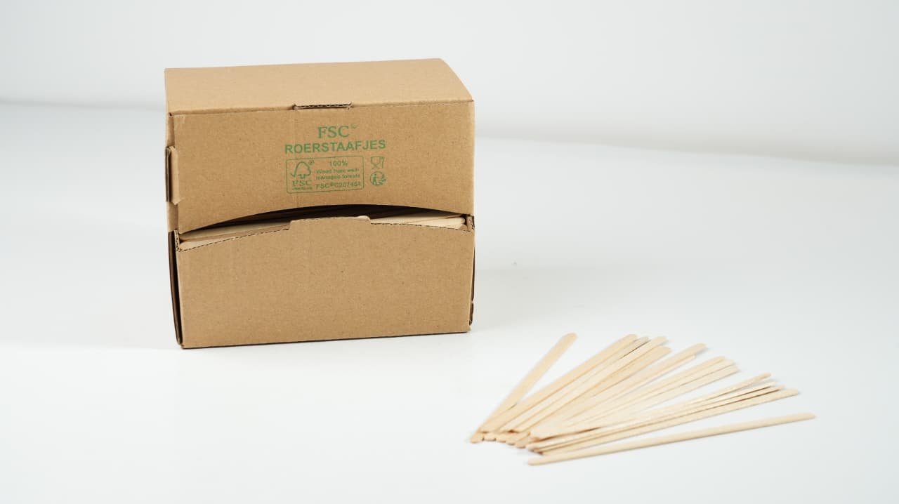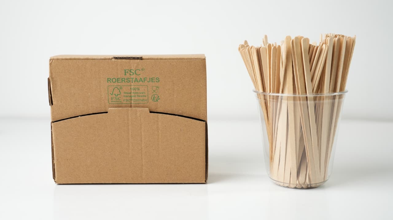 1000x Roerstaafjes in dispenser box 14cm FSC 100% Hout