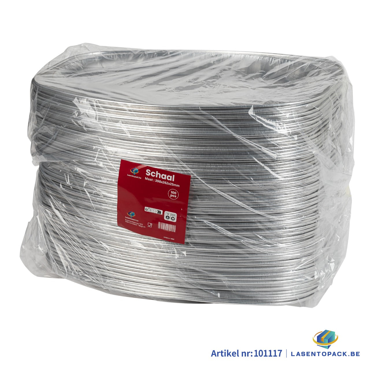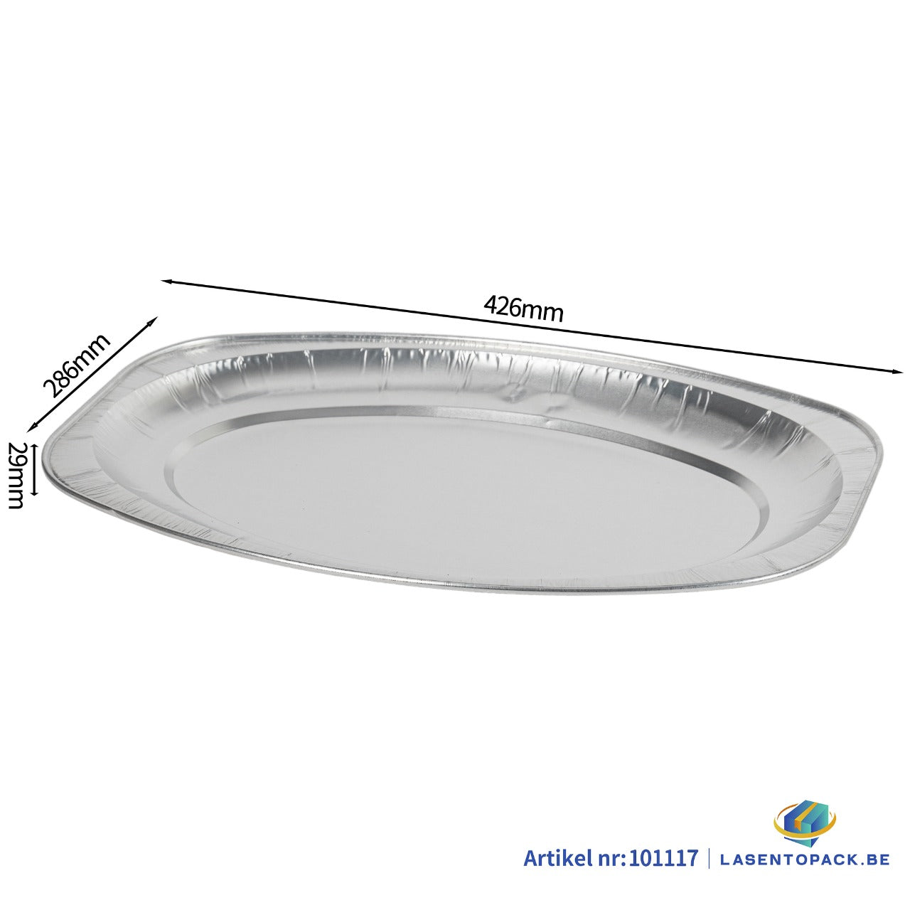 Aluminium Schaal met afmetingen 426 x 286 x 29 mm en afgeronde hoeken. Geschikt voor serveren, bakken en verwarmen in de oven. Verpakking: 100 stuks per doos.