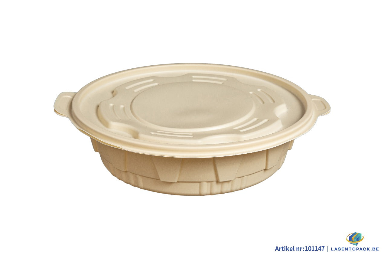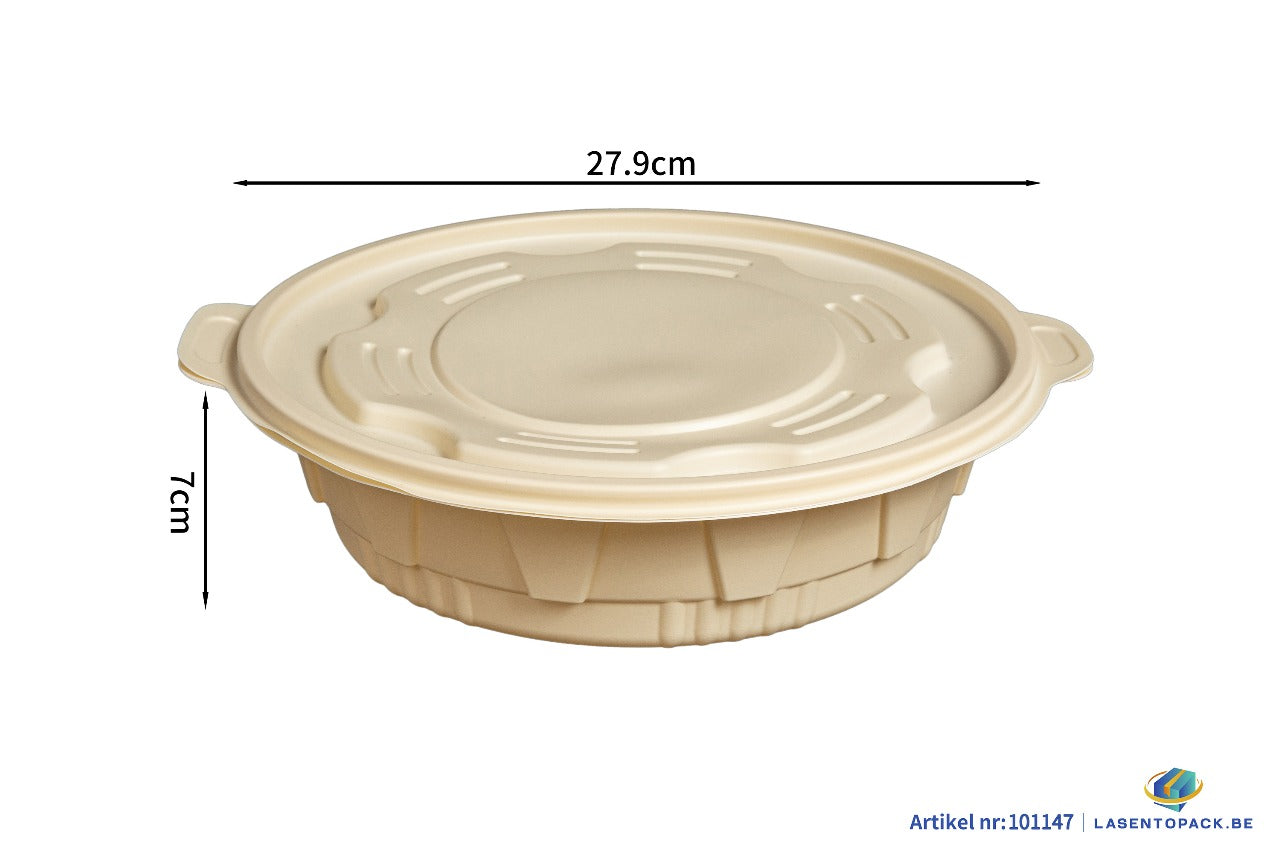 100 Stuks Maaltijdbowl 2500 ml met Deksel | Ø 27,9 cm x 7 cm | Gemaakt van PP & Maïs | Natuurlijke kleur | Magnetron- & Vriezerbestendig | 100 stuks per doos