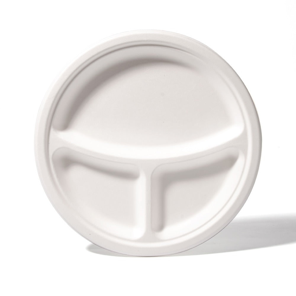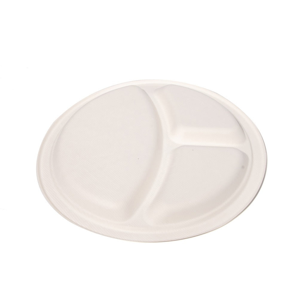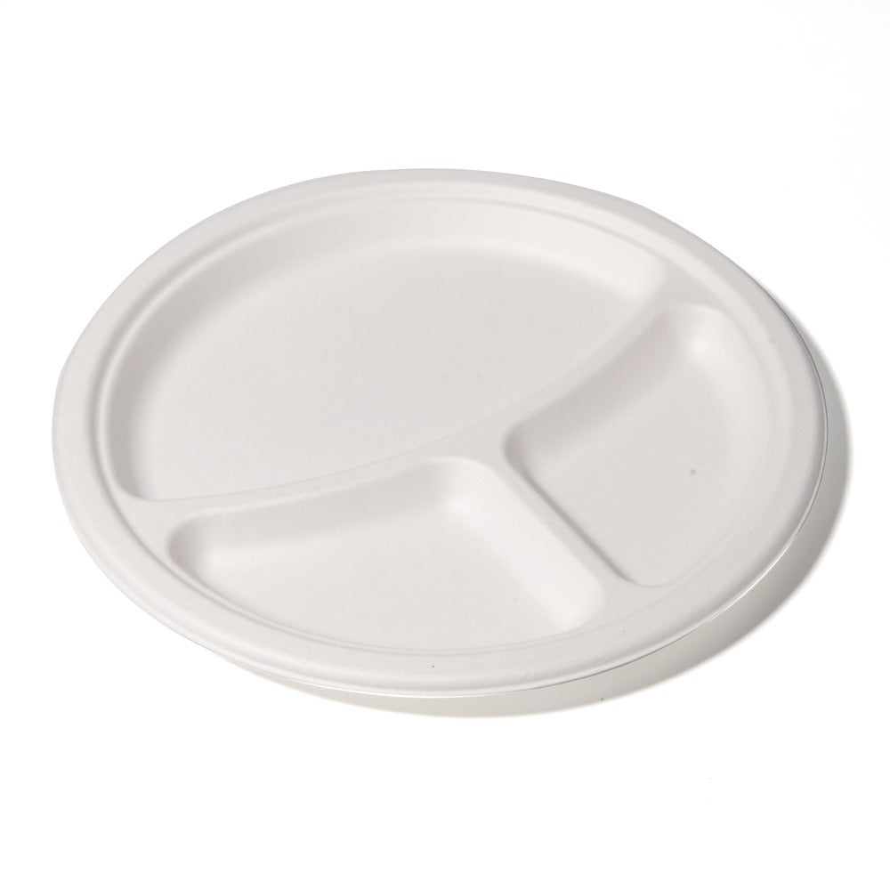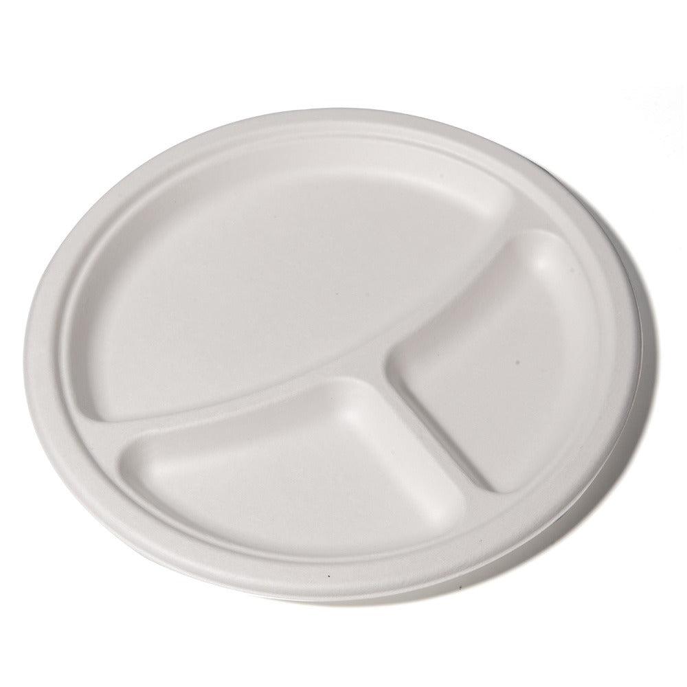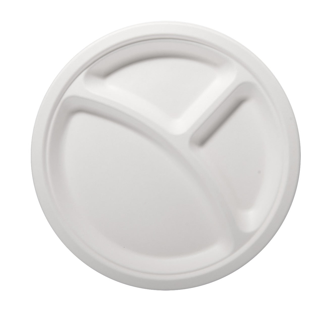 Deze hoogwaardige bord Ø26 cm (10 inch) is speciaal ontworpen voor gebruik op bijvoorbeeld festivals, catering, picknicks en andere evenementen waar duurzaamheid en gebruiksgemak belangrijk zijn. Het bord is voorzien van drie vakken, waardoor je verschillende gerechten gemakkelijk gescheiden kunt serveren, ideaal voor hapjes, snacks of complete maaltijden.